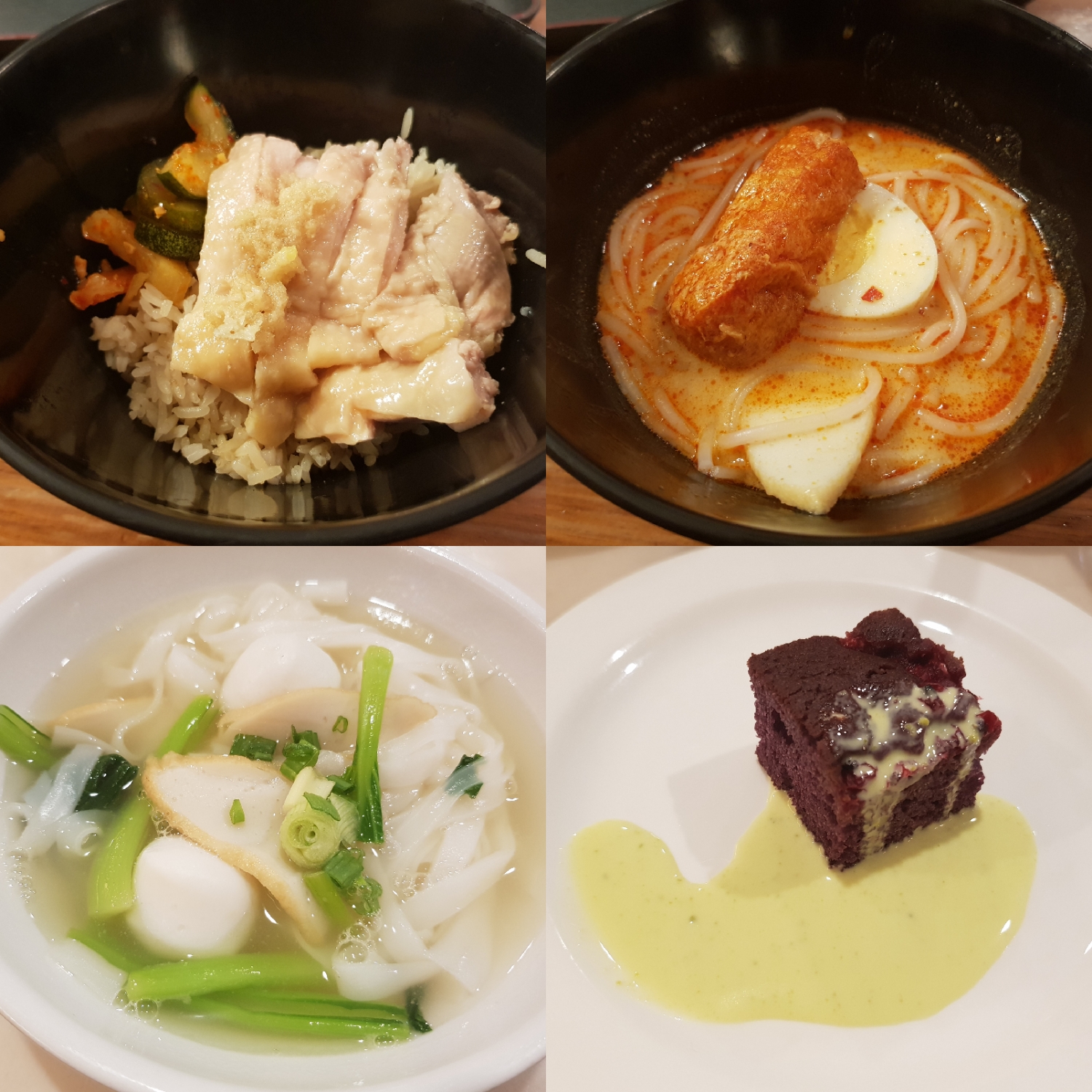 <p>Hainanese Chicken Rice, Laksa, Kway Teow Soup and Fruity Red Velvet With Pistachio Sauce</p>