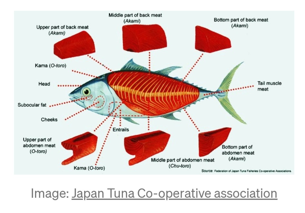 <p>You may refer to the various parts of a tuna captured in a visual image (courtesy of Japan Tuna Co-operative Association) above to better aid in understanding and appreciation. </p>